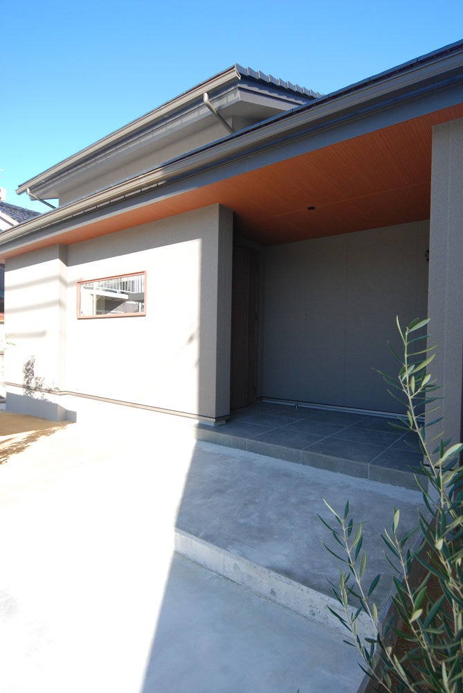 ・木目の軒天と600角タイルの玄関ポーチ