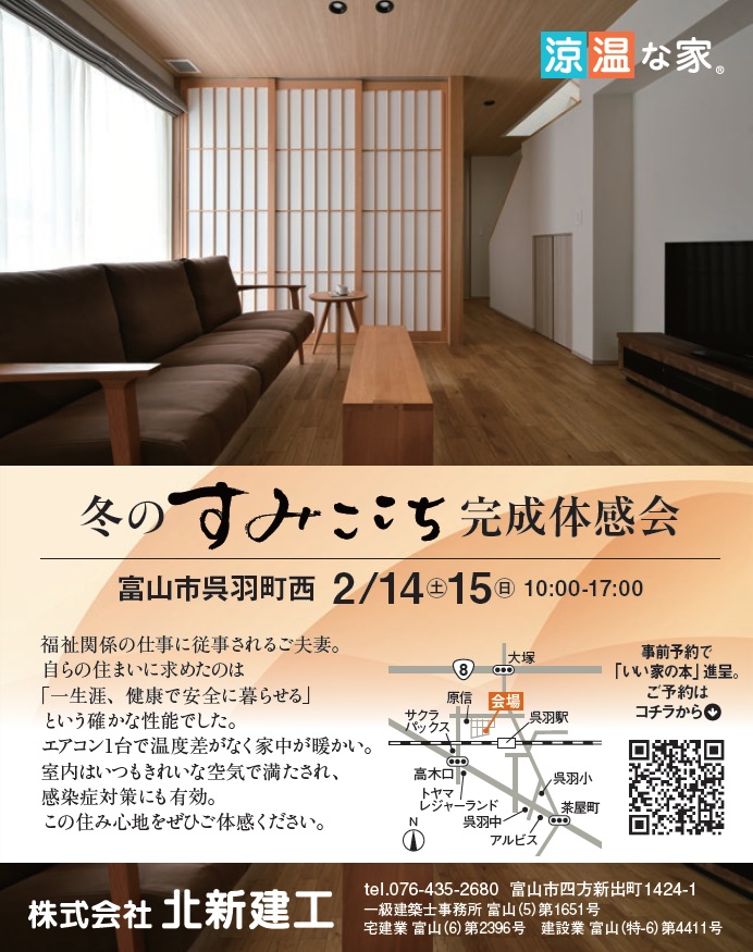11月16日(土)、17日(日)の2日間、富山市大泉本町にて「涼温な家」完成体感会を開催します。
