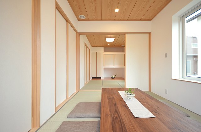 メープルの床板に合わせて、建具や天井板を選び 明るくてやさしい感じの
