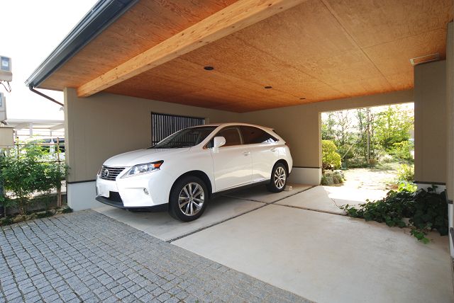 家の左前に普通車2台と軽四2台分程度のオープンガレージを増築しています。