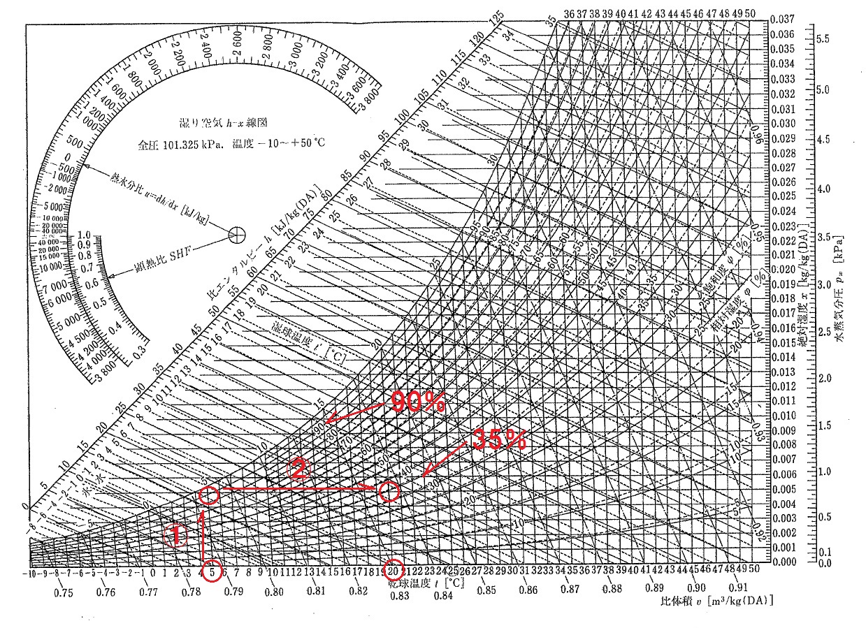 この空気、室内に入って、20℃に加温されるとしますと②の矢印。