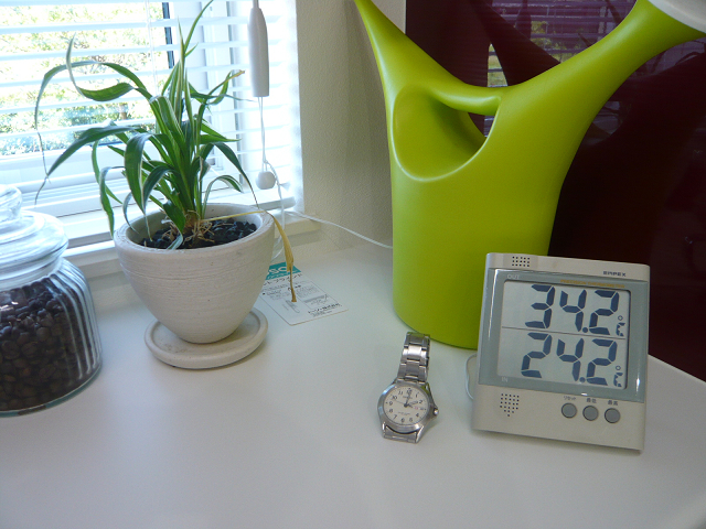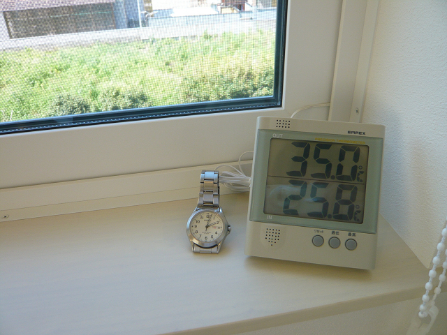(温度計の上段は外気温、下段は室内の温度)