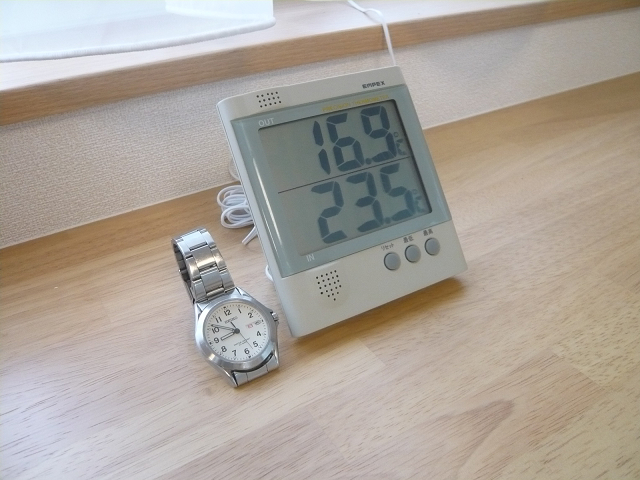 (温度計の上段は外気温、下段は室内の温度を示します。)
