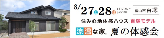 次の住み心地体感会は、8月27日(土)、28日(日)の2日間、富山市百塚の住み心地体感ハウスです。お待ちいたしております。