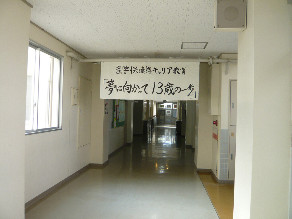 県では、中学2年生を対象とした「社会に学ぶ『14歳の挑戦』」という職業体験学習が行われておりますが、この活動への意欲を高めるために中学1年生を対象とした「夢に向かって『13歳の一歩』」という職業学習が、ここ和合中学校では行われています。