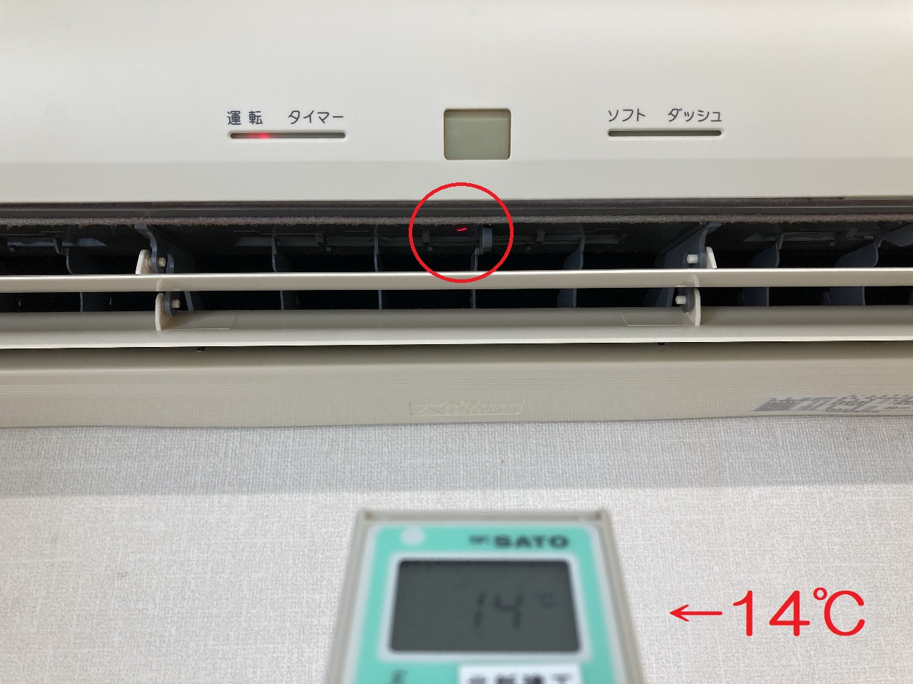 上の写真はごく一般的な壁掛けエアコンですが、吹き出し部の内部の温度は14℃を示しています。