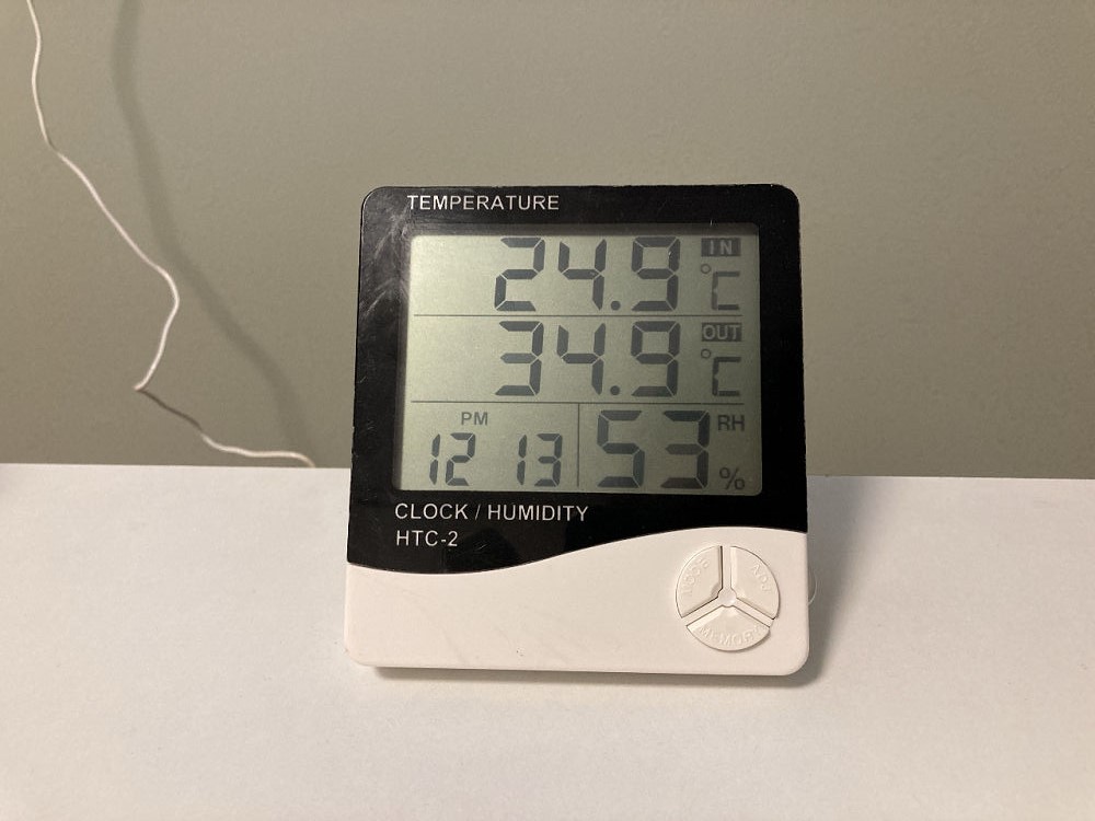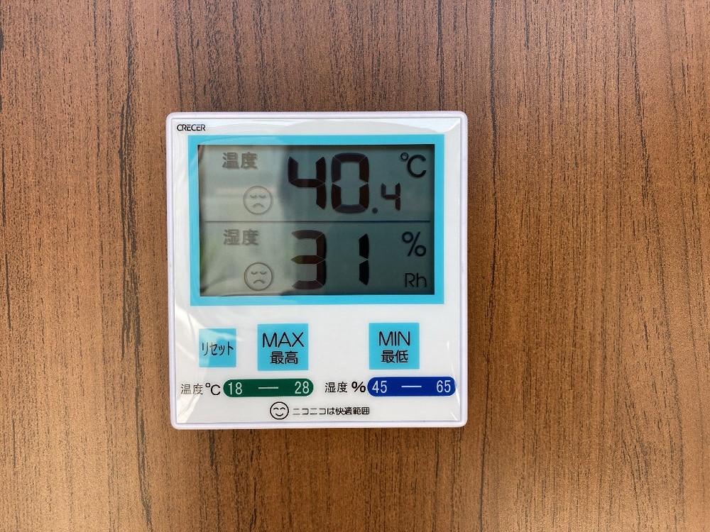 キッチンカウンター上の室温は24℃。窓外36℃。