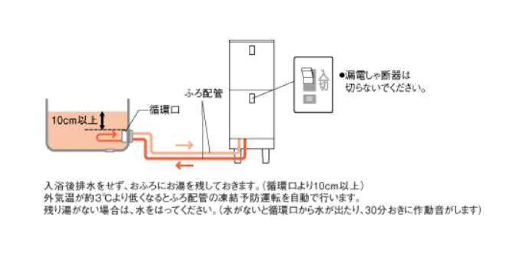 |HOME| 03<< 04/123456789101112131415161718192021222324252627282930>>05 2023/01/24 (Tue) エコキュートの凍結予防 最強寒波が到来しています。 エコキュートの凍結予防としては、浴槽にお湯(または水)をはっておいてください。 フルオートタイプのエコキュートは、浴槽と給湯器をつなぐ循環パイプに水が残りますが、この水が凍結することがあります。 浴槽に水がはってあると、この水を循環させて凍結予防運転を行います。 凍結予防運転は夜中ばかりでなく、日中でも外気温が規定値より下がれば作動しますので、日中も水をはっておかれるといいです。 浴槽にはる水の量は、循環口より10cm以上です。 出展~パナソニックHPより 未選択 << prev 650 648 647 646 645 644 643 642 641 640 639 next >> カレンダー 03 2026/04 05 1 2 3 4 5 6 7 8 9 10 11 12 13 14 15 16 17 18 19 20 21 22 23 24 25 26 27 28 29 30 プロフィール HN:北川 剛 HP:北新建工 最新記事 打出の獅子舞 (04/08) 桜、満開です (04/03) 本郷中部 売土地情報 (03/24) 住まい LIVE FAIR 2026 のご案内 (03/10) 2/14、15 冬の住み心地体感会 (02/07) カテゴリー ごあいさつ ( 95 ) 体感見学会 ( 180 ) 体感ハウス詳細 ( 5 ) 涼温な家 工法 ( 15 ) 未選択 ( 188 ) 施工例 ( 52 ) 雑誌・書籍 ( 77 ) イベント ( 52 ) 住み心地感想 ( 14 ) 不動産情報 ( 14 ) 体感ハウス リポート ( 15 ) ZEH普及実績と目標の公表 ( 10 ) ブログ内検索 アーカイブ 2026年04月 (2) 2026年03月 (2) 2026年02月 (1) 2026年01月 (3) 2025年12月 (2) 2025年11月 (1) 2025年10月 (1) 2025年09月 (2) 2025年08月 (4) 2025年07月 (1) 2025年06月 (2) 2025年05月 (3) 2025年04月 (2) 2025年03月 (2) 2025年02月 (3) 2025年01月 (2) 2024年12月 (1) 2024年11月 (2) 2024年09月 (2) 2024年08月 (3) 2024年07月 (1) 2024年06月 (1) 2024年05月 (2) 2024年04月 (4) 2024年02月 (3) 2024年01月 (3) 2023年12月 (2) 2023年11月 (2) 2023年10月 (2) 2023年09月 (2) 2023年08月 (3) 2023年07月 (2) 2023年06月 (1) 2023年05月 (3) 2023年03月 (2) 2023年02月 (4) 2023年01月 (3) 2022年12月 (3) 2022年11月 (3) 2022年10月 (3) 2022年09月 (2) 2022年08月 (2) 2022年07月 (3) 2022年06月 (3) 2022年05月 (3) 2022年04月 (3) 2022年03月 (3) 2022年02月 (2) 2022年01月 (3) 2021年12月 (3) 2021年11月 (1) 2021年10月 (4) 2021年09月 (2) 2021年08月 (2) 2021年07月 (3) 2021年06月 (3) 2021年05月 (7) 2021年04月 (3) 2021年03月 (6) 2021年02月 (3) 2021年01月 (4) 2020年12月 (8) 2020年11月 (4) 2020年10月 (2) 2020年09月 (5) 2020年08月 (6) 2020年07月 (6) 2020年06月 (4) 2020年05月 (4) 2020年04月 (5) 2020年03月 (6) 2020年02月 (3) 2020年01月 (3) 2019年12月 (3) 2019年11月 (3) 2019年10月 (10) 2019年09月 (3) 2019年08月 (5) 2019年07月 (3) 2019年06月 (5) 2019年05月 (2) 2019年04月 (7) 2019年03月 (3) 2019年02月 (4) 2019年01月 (2) 2018年12月 (3) 2018年11月 (4) 2018年10月 (1) 2018年09月 (1) 2018年08月 (4) 2018年07月 (3) 2018年06月 (2) 2018年05月 (4) 2018年04月 (5) 2018年03月 (3) 2018年02月 (2) 2018年01月 (2) 2017年12月 (4) 2017年11月 (3) 2017年10月 (2) アクセス解析 グルメ
