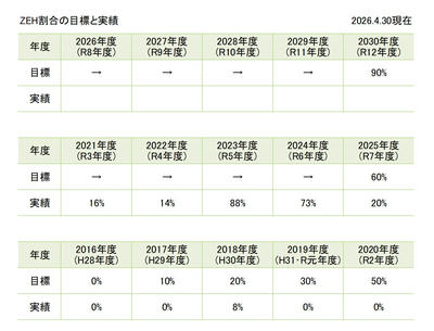 一般社団法人 環境共創イニシアチブのネット・ゼロ・エネルギー・ハウス(ZEH)支援事業について、2025年度(令和7年度)の普及実績、及び2030年度(令和12年度)フェーズ3の目標を以下の通り公表いたします。