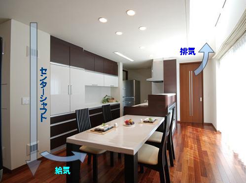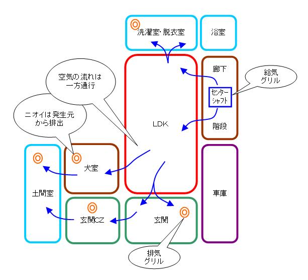 新鮮空気が、リビングを通ってワンちゃん室へ流れるという、空気の