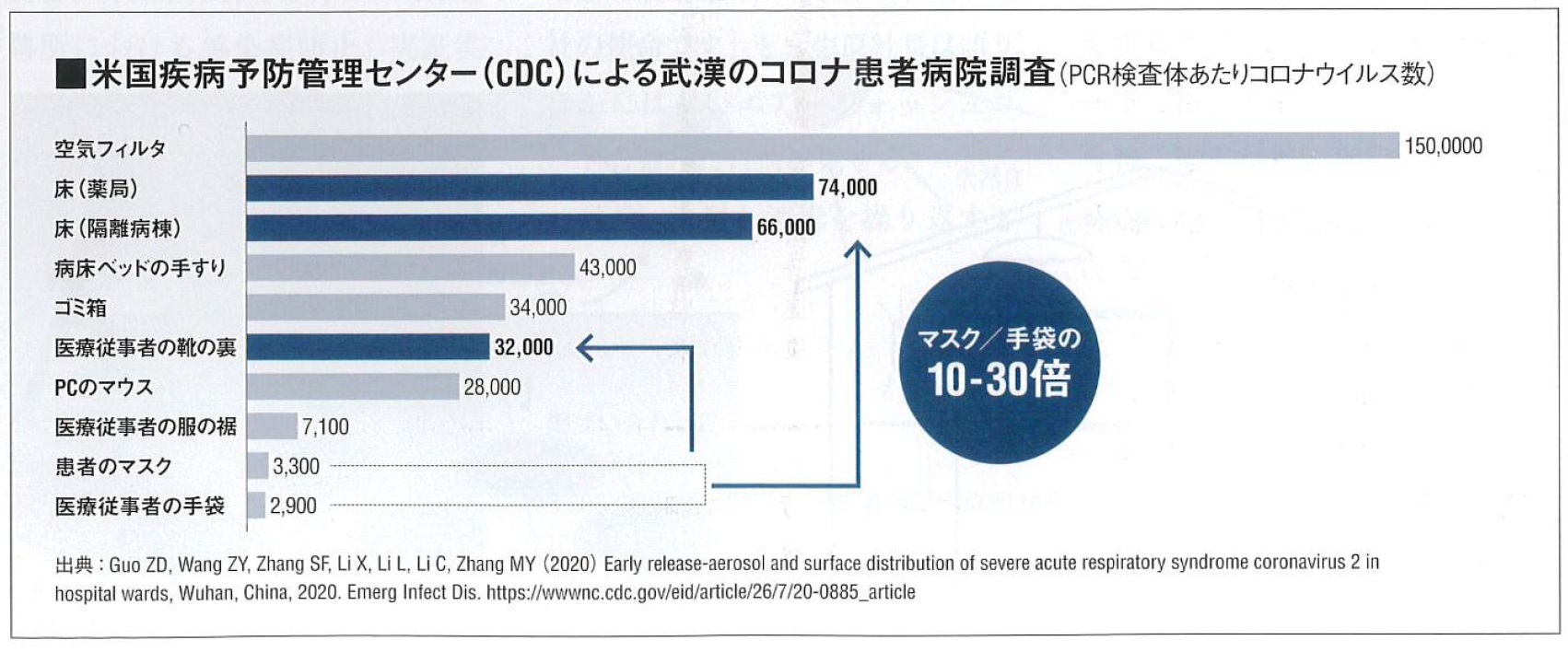 米国疾病予防管理センター(CDC)による武漢のコロナ患者病院調査によると、コロナウイルスの数は床や医療従事者の靴の裏で多く検出され、その数はマスクや手袋の10~30倍にもなるとのこと。