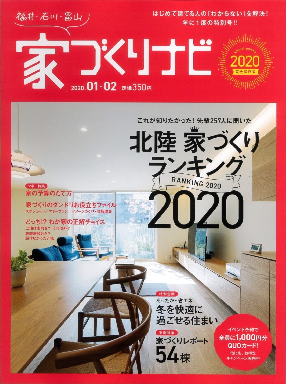 巻頭特集は「これが知りたかった!先輩257人に聞いた北陸家づくりランキング2020」。