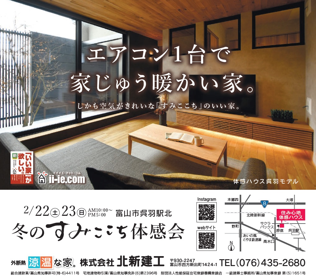 2月22日(土)、23日(日)の2日間、呉羽駅北の住み心地体感ハウス・呉羽モデルにて、「涼温な家」冬のすみここち体感会を開催します。