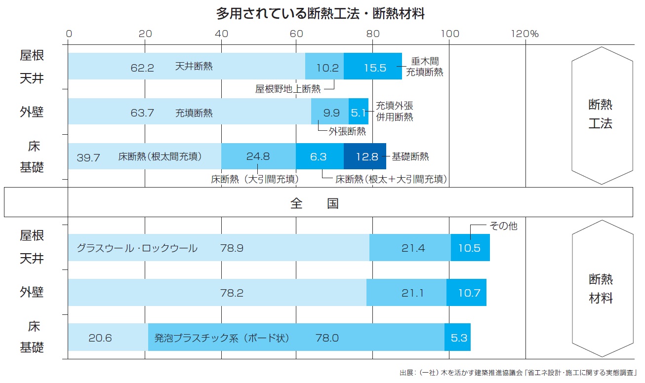 これによると、木造住宅の大部分が天井断熱、外壁の充填断熱