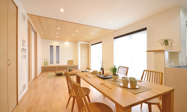 メープルの床板に合わせて、建具や天井板を選び 明るくてやさしい感じの